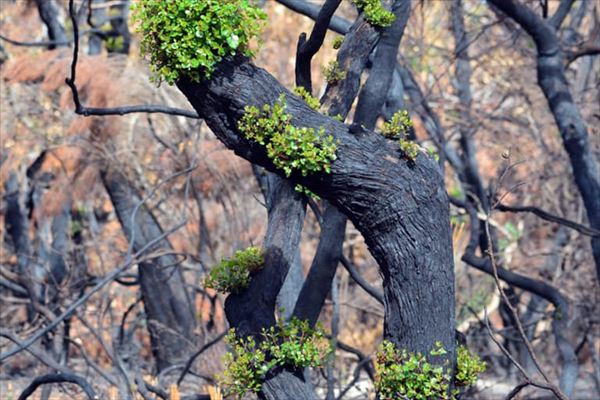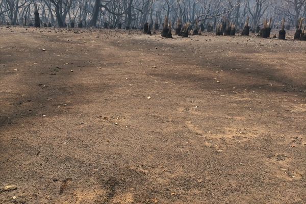 2018年12月20日、かつてない規模の森林火災がカンガルー島で発生しました。火種が確認された場所は保護地区(人が立ち入れない区域)であったため初期消火が行われず、翌年1月には島の半分以上が焼失する事態となりました。この火災により、生産者の自宅は焼失し、ミツバチの約半数を失いました。さらに、フィールドに置かれていた巣箱の中のはちみつ20トンも失われました。コアラについても深刻な被害があり、島に生息していた約5万頭のうち半数の2万5千頭が犠牲になったと推測されています。蜂場周辺のユーカリの大木は根まで焼かれて枯死し、今は幹だけが立ち並ぶ殺伐とした景観となっています。大規模火災の影響は生き残ったミツバチ群にも及び、産卵をやめてしまった女王蜂が現れるなど、これまでにない異常が見られています。今後は女王蜂の更新が有効な対策になると考えられています。ミツバチ群のおよそ半数が焼失し、養蜂家にとって心配は尽きません。それでも、生産者は少しずつ前を向き、再生に向けて懸命に努力を続けています。