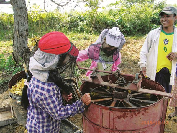 ナツメ、ヒマワリ、百花蜜などを輸入しています。ミャンマーでは、雨季(6月~9月)を除いた年間約8カ月間、採蜜が可能です。ミャンマーで採れるヒマワリはちみつは、2019年に開催された第46回アピモンディア(国際養蜂家連合)主催の品評会で金賞を受賞した実績があり、世界的にも高く評価される品質のはちみつです。藤井養蜂場は、養蜂技術がまだ発展途上にあるミャンマーに直接赴き、現地の養蜂家への技術指導を行っています。さらに、養蜂器具や資材の提供などを通じて養蜂家を支援するため、日本で販売したミャンマー産はちみつの売上金の一部を寄付する活動も続けています。