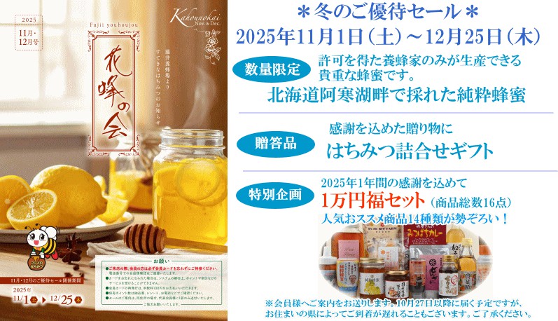 12月25日まで開催しております優待セールは、花蜂の会会員様にしかご提供できない価格の人気商品を沢山取り揃えております。【入会金 300円 / 年会費 無料】ですので、ご入会ご希望の方やご質問のある方は、お電話や直売店にてお気軽にお尋ねください。